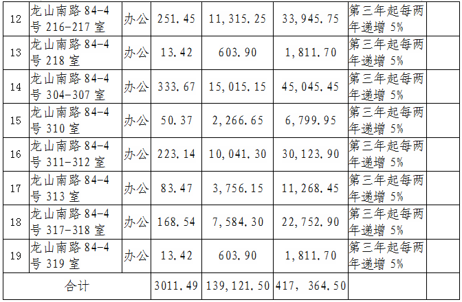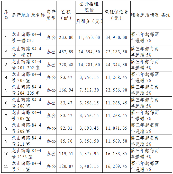 根據(jù)國有企業(yè)資產(chǎn)出租管理相關(guān)制度,我司決定對位于思明區(qū)龍山南路84-4號樓部分面積房產(chǎn)對符合入駐條件的意向承租人進(jìn)行公開競價(jià)招租,具體信息如下: