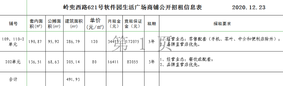 6、競租保證金:詳見附表(軟件園生活廣場公開招租信息表)。